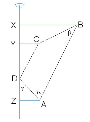 zorro post贸w: 106 | 2013-03-13 19:23:32Zaczynamy od obliczenia trapezu. Brakuje nam bok贸w c i d. W tym trapezie mamy: $\left\{\begin{matrix} a=c*cos\alpha+b+d*cos\beta\\ c*sin\alpha=d*sin\beta \end{matrix}\right.$ $\left\{\begin{matrix} c*cos\alpha+d*cos\beta=a-b \\ c*sin\alpha-d*sin\beta=0 \end{matrix}\right.$ Stosuj膮c metod臋 wyznacznik贸w, (lub licz膮c przez podstawianie)wyliczamy: $c=\frac{(a-b)sin\beta}{sin(\alpha+\beta)}$ $d=\frac{(a-b)sin\alpha}{sin(\alpha+\beta)}$ Teraz: $r_{1}=c*sin\gamma$ $h_{1}=c*cos\gamma$ $\gamma+(90^{o}-\alpha)+90^{o}+\angle YDC=180^{o}$ $\angle YDC=\alpha-\gamma$ $r_{2}=b*sin(\alpha-\gamma)$ $h_{2}=b*cos(\alpha-\gamma)$ $\angle XBC=90^{o}-[\beta+(\alpha-\gamma)]$ $\angle XBC=90^{o}-(\alpha+\beta-\gamma)$ $r_{3}=r_{2}+d*cos(90^{o}-(\alpha+\beta-\gamma))$ $r_{3}=r_{2}+d*sin(\alpha+\beta-\gamma)$ $h_{3}=d*sin(90^{o}-(\alpha+\beta-\gamma))$ $h_{3}=d*cos(\alpha+\beta-\gamma)$ Przyjmijmy te偶 pomocniczo: $H=h_{1}+h_{2}+h_{3}$ Wszystkie te warto艣ci mamy ju偶 policzone wi臋c czas przyst膮pi膰 do sedna: |