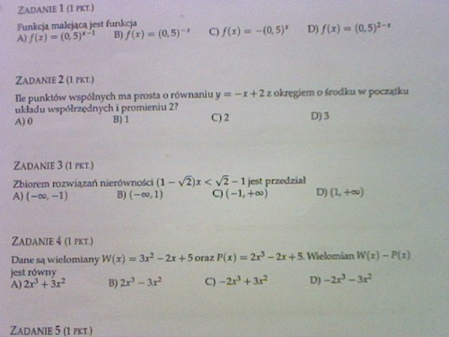 tumor post贸w: 8070 | 2013-03-21 21:29:00Regulamin forum m贸wi, 偶eby nie wkleja膰 skan贸w. Zatem edytuj post i zadania przepisz. 1. Funkcja wyk艂adnicza $a^x$ jest malej膮ca dla $0<a<1$, natomiast funkcja $-a^x$ jest malej膮ca dla $1<a$. Ogl膮damy te funkcje i patrzymy, kt贸ra jest tej postaci. A) $f(x)=(0,5)^{x-1}=2(0,5)^{x}$ malej膮ca B) $f(x)=(0,5)^{-x}=2^{x}$ rosn膮ca C) $f(x)=-(0,5)^{x}$ rosn膮ca D) $f(x)=(0,5)^{2-x}=2^{x-2}=0,25*2^x$ rosn膮ca |