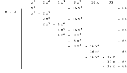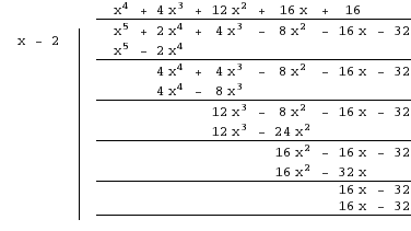 abcdefgh postów: 1255 | 2013-04-25 23:08:05w(2)=64-128+64 ![]() $(x-2)(x^5+2x^4+4x^3-8x^2-16x-32)$ w(2)=32+32+32-32-32-32=0 ![]() $(x-2)^2(x^4+4x^3+12x^2+16x+16)$=(x-2)^2(x^2+2x+4)^2 |