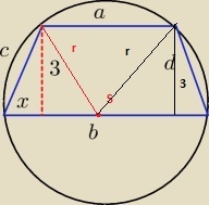 abcdefgh post贸w: 1255 | 2013-05-26 16:17:17![]() a=8 i h=3 $r^2=4^2+3^2$ $r^2=16+9$ $r=5$ d=10=b $x=\frac{10-8}{2}$ $x=1$ trapez r贸wnoramienny c=d c^2=1+9=10 c=$\sqrt{10}$ $L=2\sqrt{10}+18$ Wiadomo艣膰 by艂a modyfikowana 2013-05-26 16:22:42 przez abcdefgh |
