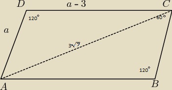 abcdefgh post贸w: 1255 | 2013-06-01 19:42:54![]() tr贸jk膮t ACD twierdzenie cosinus贸w $(3\sqrt{7})^2=a^2+(a-3)^2-2*a(a-3)*cos120^{o}$ $63=a^2+a^2-6a+9-2(a^2-3a)*cos(180^{o}-60^{o})$ $63=2a^2-6a+9-2(a^2-3a)*(-cos60^{o})$ $63=2a^2-6a+9-2(a^2-3a)*\frac{-1}{2}$ $63=2a^2-6a+9-a^2+3a$ $63=a^2-3a+9$ $a^2-3a-54=0$ $\delta=225$ $\sqrt{\delta}=15$ $a_{1}=9$ $a_{2}=-6$ a<0 sprzeczno艣c $a=9$ $a-3=6$ $P=6*9*sin60^{o}$ $P=54*\frac{\sqrt{3}}{2}=27\sqrt{3}$ |