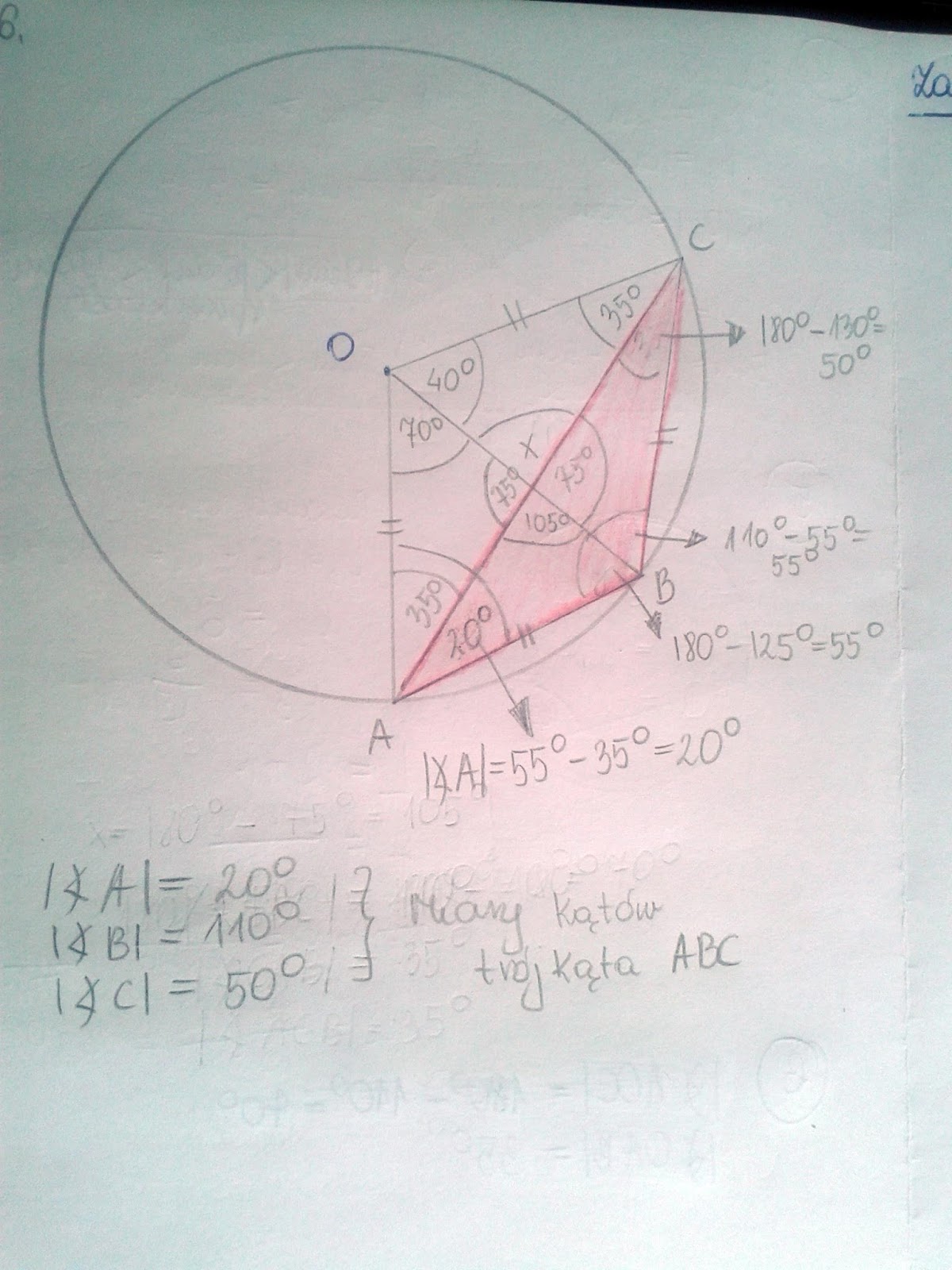 nice1233 post贸w: 147 | 2016-05-27 13:39:23Na rysunku obok dane s膮 miary k膮t贸w 艣rodkowych: |$\angle$AOB| = 70掳, |$\angle$BOC| = 40掳. Wyznacz miary k膮t贸w tr贸jk膮ta ABC. Rysunek do zadania ![]() Czy dobrze rozw. https://2.bp.blogspot.com/-FqbP2MB5BDM/V0gluqhqoZI/AAAAAAAACzk/SIDzsMgnDvwOoMDPI17m_qqVCSrhsfjmQCLcB/s1600/Zdj%25C4%2599cie-0021.jpg |