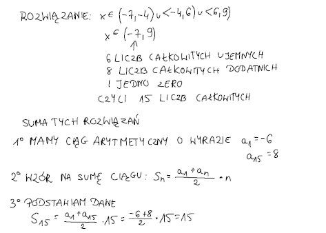 mat3ux postów: 16 | 2021-01-06 02:49:21Witam, mam następujący problem, mam znaleźć sume wszystkich liczb całkowitych spełniających nierówność $|x+4|+|x-6|<16$ Rozdzieliłem to na 3 możliwość od 1.$x\epsilon (-\infty,-4>$ 2. $x\epsilon (-4,6>$ 3. $x\epsilon (6,\infty)$ Po obliczeniach wychodzi że x>-9 lub x<9 więc włącznie z zerem mamy 17 liczb całkowitych, w odpowiedzi jest 15, proszę o wyjaśnienie jaki błąd popełniam |