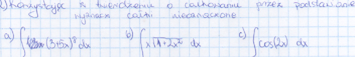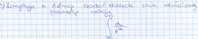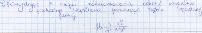 janusz78 post贸w: 820 | 2015-06-02 16:37:46Zadanie 1 a) $\int (3+5x)^8dx $ $3 +5x =t, 5dx =dt, dx=\frac{1}{5}dt$ $\frac{1}{5}\int tdt = \frac{1}{5}(3x+5)+C.$ b) $\int(x\sqrt{1+x^2}dx$ $\sqrt{1+x^2}=t, 1+x^2=t^2, 2xdx=2tdt, xdx=tdt,$ $\int t^2dt = \frac{t^3}{3}+C= \frac{1}{3}(\sqrt{1+x^2})^3+ C.$ c) $\int\cos(2x)dx $ $2x =u, 2dx =du, dx=\frac{1}{2}u.$ $\frac{1}{2}\int cos(u)du = \frac{1}{2}\sin(u)+C= \frac{1}{2}sin(2x)+C.$ Zadanie 4 - patrz rozwi膮zanie Forum Zadanie 5 $\int_{-\infty}^{0}\frac{1}{e^{4x}}dx = \int_{-\infty}^{0}e^{-4x}dx= -\frac{1}{4}e^{-4x}|_{x\rightarrow -\infty}^{0}= -\frac{1}{4}+ \infty = \infty.$ Ca艂ka rozbie偶na do $\infty.$ Zadanie 6 $f\'_{|x}(x,y)= \frac{yx^{y-1}-x^{y}\cdot 1}{(x+y^{x})^2}.$ $f\'_{|y}(x,y)= \frac{x^{y}\ln(x)(x+y^{x})-x^{y}\cdot xy^{x-1}}{(x+y^{x})^2}.$ |