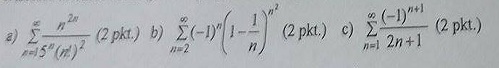 janusz78 postów: 820 | 2015-12-13 21:37:06Pierwszy szereg - bezbłędnie. Drugi- kryterium Leibniza, nie Cauchy, bo szereg naprzemienny. i ciąg $( 0 < a_{n}= (1-1/n)^{n^2}) $-zbieżny do $ 0 $ - szereg zbieżny Trzeci na podstawie kryterium Leibniza, bo szereg naprzemienny, ciąg $ 0< a_{n}= \frac{1}{2n+1}$ malejący, zbieżny do zera - szereg zbieżny. Wiadomość była modyfikowana 2015-12-13 22:16:16 przez janusz78 |