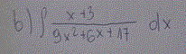 kadia postów: 11 | 2016-01-24 20:34:17∫x/9x2+6x+17dx + ∫3/9x2+6x+17dx = ∫18x/162+108+306dx +∫1/3x2+2x+17dx= i nie wiem co dalej od tej pierwszej odejmować 6 ? |