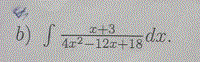 janusz78 postów: 820 | 2016-01-24 19:23:23Patrz regulamin forum, skany nie są mile widziane! $ \int\frac{x+3}{9x^2+6x +17}dx = \int \frac{x}{9x^2+6x+17}dx +\int\frac{3}{9x^2+6x +17}dx = I_{1}+ I_{2}.$ Pierwszą z całek sprowadzamy do pochodnej z logarytmu naturalnego mnożąc licznik i mianownik przez 18 oraz dodając - i odejmując 6 (żeby się nic nie zmieniło). A drugą z całek wraz z całką wynikającą z odjęcia 6, to jest całkę $ \frac{8}{3}\int \frac{1}{9x^2+6x +17}dx $ sprowadzamy do całki z arkusa tangensa, przekształcając trójmian kwadratowy $9x^2 +6x +17 $ do postaci kanonicznej. Drugą całkę b) obliczamy w ten sam sposób. Wiadomość była modyfikowana 2016-01-24 20:23:43 przez janusz78 |