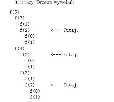 tumor post贸w: 8070 | 2016-06-20 18:56:46Aha, chodzi o czytanie polecenia ze zrozumieniem. Nie pytano ile razy b臋dzie ona wywo艂ana (bardzo du偶o), tylko ile razy b臋dzie wywo艂ana z argumentem 2. Rzeczywi艣cie wywo艂anie f(2) w czasie oblicze艅 zwi膮zanych z f(5) jest trzykrotne. (w mojej rozpisce te偶 wida膰, gdzie) |