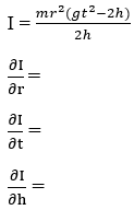 chiacynt postów: 749 | 2020-07-07 12:17:32$ I = \frac{mr^2(gt^2 -2h)}{2h} $ $ \frac{\partial I}{\partial r} = \frac{2mr(gt^2-2h)}{2h}= \frac{mr(gt^2-2h)}{h} $ $ \frac{\partial I}{\partial t} =\frac{mr^2 2gt}{2h} = \frac{mr^2gt}{h} $ $ \frac{\partial I}{\partial h} = \frac{-2mr^2\cdot 2h -mr^2(gt^2-2h)\cdot 2}{4h^2} = \frac{-2mr^2 h -mr^2(gt^2 -2h)}{2h^2}$ |