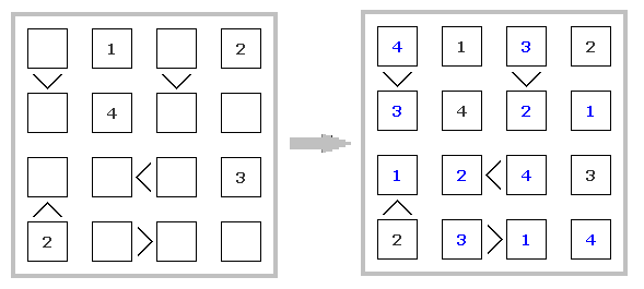 Futoshiki (nierówności) to łamigłówka liczbowa, w której pola diagramu o rozmiarze $n$ należy uzupełnić liczbami tak, aby w każdym wierszu i w każdej kolumnie znalazły się liczby od 1 do $n$. Liczby umieszczone w tym samym wierszu oraz kolumnie nie mogą się powtarzać. Między polami mogą znajdować się znaki mniejszości lub większości, które określają relację między liczbami znajdującymi się w polach przylegających do tych znaków.