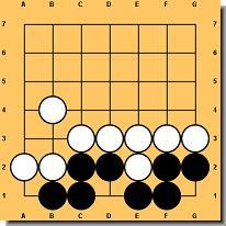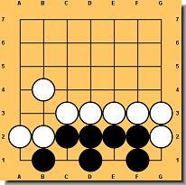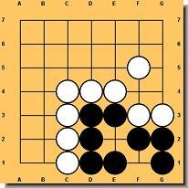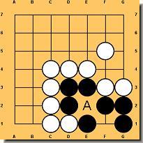 Nie można zbić grupy, która ma dwoje oczu! O oczach już było, ale trzeba powiedzieć jakie warunki musi spełniać punkt, aby można było go nazwać okiem. Na rysunku 27 czarna grupa nie może być zbita, ponieważ posiada dwa oka. Biały nie może zagrać w te punkty, gdyż ruchy te są zabronione (samobójstwo). Natomiast na rysunku 28 czarna grupa wygląda podobnie, ale jest istotna różnica między nimi. Biały może zbić trzy piony grając w A. Dlatego czarna grupa na tym rysunku posiada tylko jedno oko i jest martwa. Punkt A natomiast nazywamy fałszywym okiem. Jest bardzo ważne by odróżnić oczy prawdziwe od fałszywych. Jeśli potrafisz rozpoznać grupę z dwoma prawdziwymi oczami wiesz, że nie można jej zbić. Rysunek 29 i 30 pokazuje inne przykłady czarnych grup, które posiadają jedno prawdziwe i jedno fałszywe oko, wobec czego można je zbić.