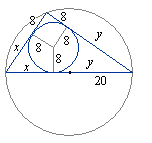 Ponieważ środek okręgu opisanego na trójkącie prostokątnym leży na środku przeciwprostokątnej, jej długość wynosi 40. Okrąg wpisany dzieli przyprostokątne na odcinki odpowiednio 8 i x, 8 i y, a x + y = 40. Obwód trójkąta równy jest x + y + 8 + x + 8 + y = 16 + 2 · 40 = 96.