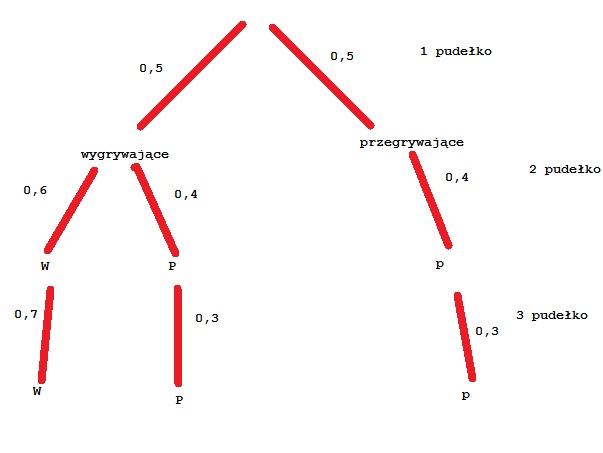 grzes190666 postów: 3 | 2012-06-09 17:47:31Z trzech pudełek z losami wyjmujemy po jednym losie. W pierwszym pudełku losy wygrywające stanowia 50% w drugim 60% a w trzecim 70% . Oblicz prawdopodobieństwo ze wylosujemy: a) trzy losy wygrywajace b) same losy przegrywajace c) conajmniej jeden los wygrywajacy Czy moze mi ktos pomoc nie moge dojsc co z tym zadnaniem juz mi sie tak namieszało z góry dziekuje |