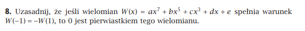 tumor post贸w: 8070 | 2018-02-21 11:36:33Podstaw za x liczb臋 1, wtedy otrzymasz W(1). Jak podstawisz za x liczb臋 -1, otrzymasz W(-1). Je艣li to wstawisz do r贸wnania W(-1)=-W(1), to wyliczysz e=0. A je艣li e=0, to mo偶na wy艂膮czy膰 x przed nawias we wzorze wielomianu. |