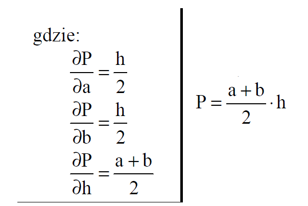 chiacynt postów: 749 | 2020-05-23 21:26:56Ze wzoru na pole trapezu obliczamy pochodne cząstkowe względem długości jego podstaw - podstawy $ a $ (ta podstawa wtedy jest zmienną) względem podstawy $ b $ (ta podstawa jest wtedy zmienną) i względem wysokości ( $ h $ jest wtedy zmienną). Obliczamy za każdym razem pochodną funkcji jednej zmiennej przy pozostałych zmiennych będącymi stałymi. |