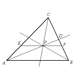 Dzieląc trójkąt ABC wzdłuż odcinka przechodzącego przez punkt P i równoległego do boku AB, podzielimy ten trójkąt na trójkąt EFC i trapez ABFE. Trójkąt EFC jest podobny do trójkąta ABC w skali . Stosunek pól figur podobnych równy jest kwadratowi skali podobieństwa. Więc pole trójkąta EFC równe jest , pole trapezu równe jest .