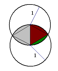 Pole rozważanej figury jest sumą pól dwóch trójkątów równobocznych o bokach długości 1 i czterech obszarów zaznaczonych na zielono.