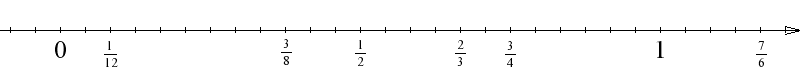 Zaznacz na osi liczbowej ułamki $\frac{2}{3}, \frac{3}{4}, \frac{7}{6}, \frac{3}{8}, \frac{1}{2}, \frac{1}{12}$.