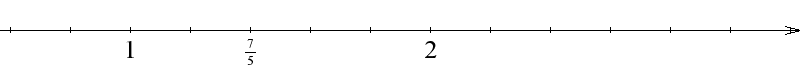 Ułamek $\frac{7}{5}$ to ułamek równy $1\frac{2}{5}$. Znajduje się więc między $1$ a $2$. Odcinek jednostkowy $[1, 2]$ dzielimy na pięć